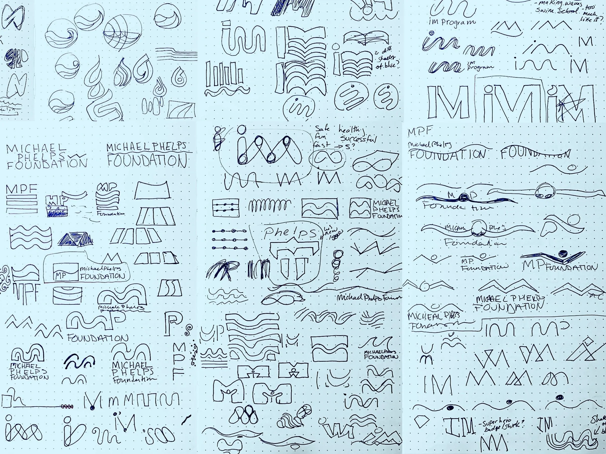 Early sketches included several takes on evolving the water concept, including combining the “M” in Michael with waves which felt like a natural solution. I also toyed around with water droplets and life preservers. I drafted a few “superhero” marks to convey a sense of valor and self-confidence for the Foundation’s ties to the Special Olympics and their mental health programming. I explored potential shapes made from swimmers’ body parts — arms, legs, swim cap — and even tried ‘connecting the dots’ with swimming pool lanes.